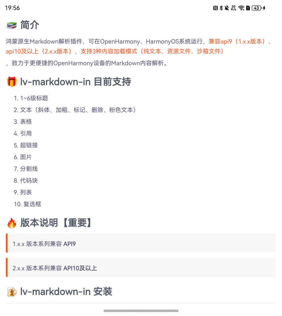 支持在OpenHarmony、HarmonyOS系统运行,支持api9(1.x.x版本)、api10及以上(2.x.x版本),致力于更便捷的OpenHarmony设备的Markdown内容解析