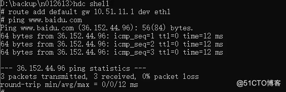 3.4 配置路由地址hdc_std shellroute add default gw 10.51.11.1 dev eth1 //10.51.11.1是网关地址,根据实际情况配置,如果不知道如何查看网关,请联系你们的网络管理员。