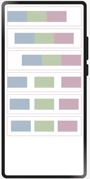 - SpaceEvenly:主轴方向元素等间距布局, 相邻元素之间的间距、第一个元素与行首的间距、最后一个元素到行尾的间距都完全一样。