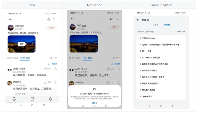 - “发现”页面,点击”同城”按钮可以通过安全控件中的位置控件获取当前定位,点击后会弹出授权通知弹窗,点击”知道了”,会跳转到”同城榜”界面并显示当前定位城市。点击”发现”页面中的”全部”按钮可以跳转到”热搜榜”界面。