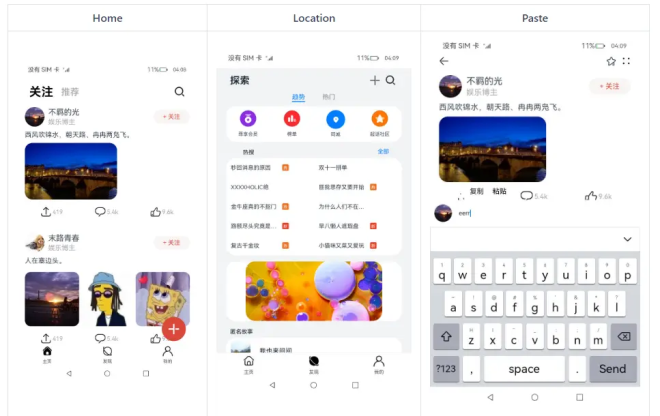 - “动态详情页”下部分展示用户的评论情况,点击底部”评论”按钮,在文本框中输入评论,长按文本框出现”复制 粘贴”按钮,点击”复制”按钮可以将选定信息写入剪贴板,点击”粘贴”按钮,可以通过安全控件中的粘贴控件从剪贴板中读取信息。