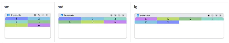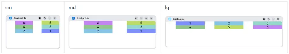 通过order属性,控制GridCol的顺序。在sm和md断点下,按照1至6的顺序排列显示;在lg断点下,按照6至1的顺序排列显示。
