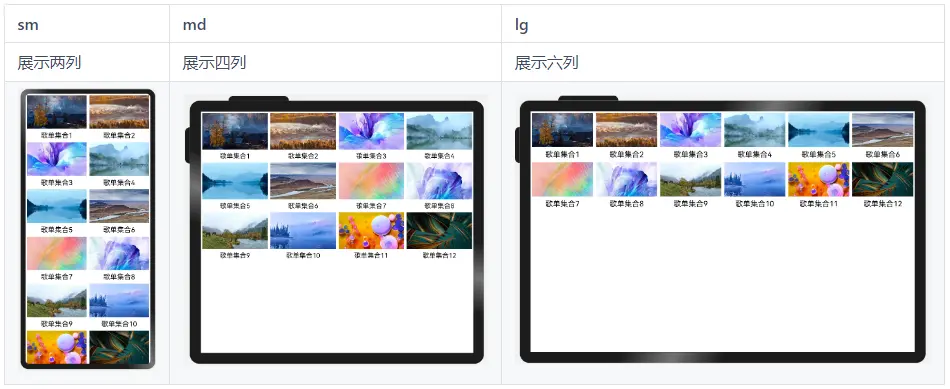 另外,由于本例中各列的宽度相同,也可以通过响应式布局能力结合 List组件 实现,通过调整不同断点下的List组件的lanes属性也可实现目标效果。