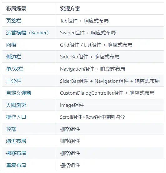 虽然不同应用的页面千变万化,但对其进行拆分和分析,页面中的很多布局场景是相似的。本小节将介绍如何借助自适应布局、响应式布局以及常见的容器类组件,实现应用中的典型布局场景。